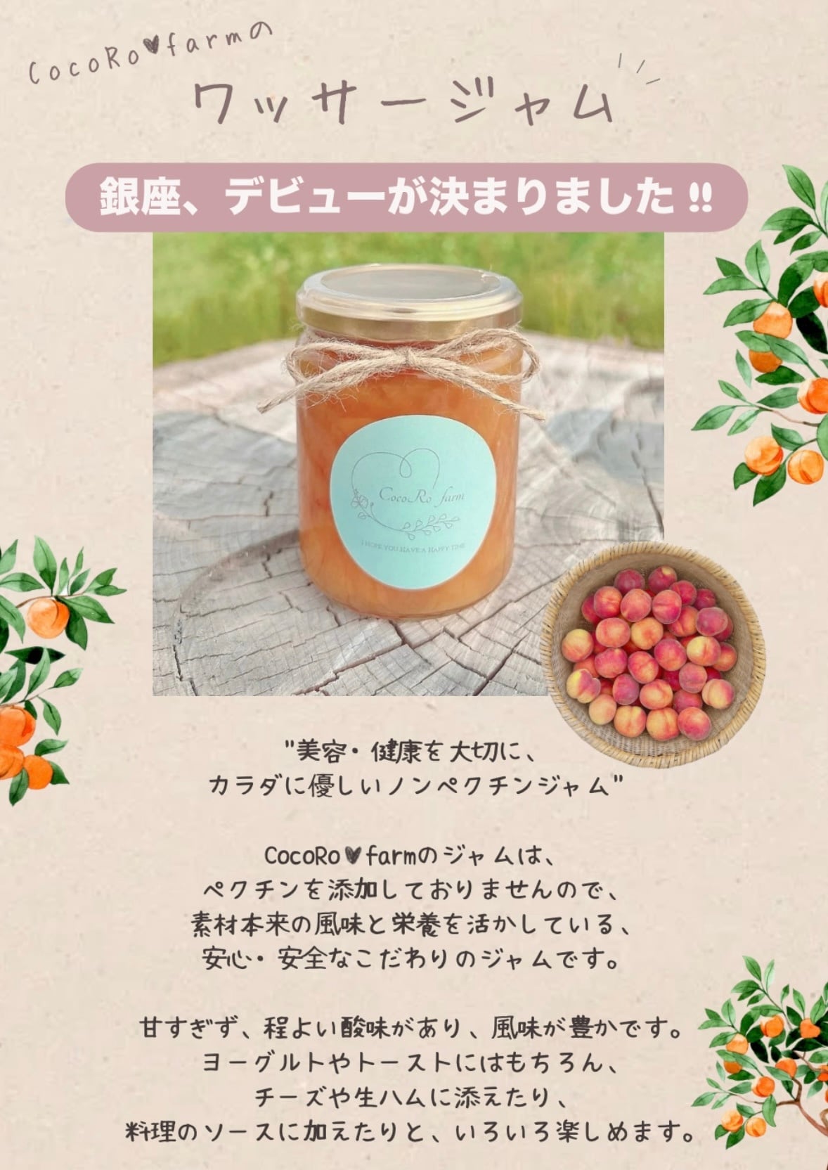 CocoRo♡farmの新鮮なワッサーを使用したワッサージャム。甘すぎず、程よい酸味があり、風味が豊かです。ヨーグルトやトーストにはもちろん、チーズや生ハムに添えたり、料理のソースに加えたりといろいろ楽しめます。 ✼••┈┈••✼••┈┈••✼ "美容・健康を大切に♡ カラダに優しいノンペクチンジャム" CocoRo♡farmのジャムは、ペクチンを添加しておりませんので、素材本来の風味と栄養を活かしている、安心・安全なこだわりのジャムです。 賞味期限:2026.08.16